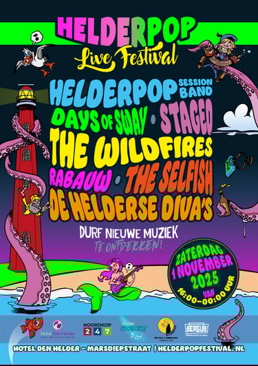 Helderpop Live Festival 2025 brengt muziek uit de regio op een professioneel podium. In samenwerking met partners zoals Noordkop 247 en Hotel Den Helder bouwen we aan een jaarlijks terugkerend muziekspektakel waar alles draait om live beleving.